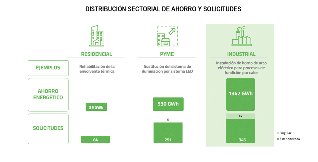 El sector industrial ha sido el principal protagonista en la monetización de sus ahorros energéticos, concentrando 410 solicitudes (54% del total) y logrando una reducción de consumo de 1.342 GWh, lo que equivale al 70,4% del ahorro registrado. Le sigue el sector terciario, con 256 actuaciones (35%) y un ahorro de 530 GWh (27,8%). En contraste, el sector residencial ha tenido una participación más reducida, con solo 84 solicitudes (11%) y un ahorro de 35 GWh, lo que representa apenas el 1,8% del total.