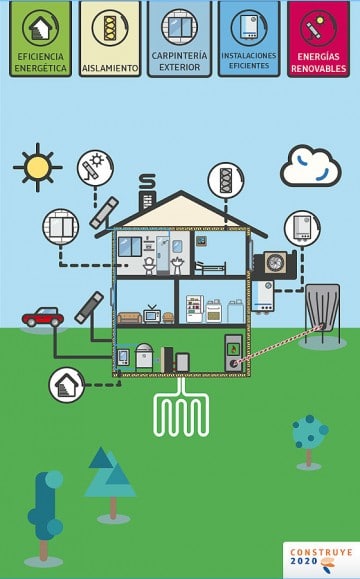 – Energías renovables: se incluye un esquema con la descripción de la instalación de los sistemas de energía renovable más comunes (solar térmica, solar fotovoltaica, geotérmica, biomasa y aerotermia) y sus características principales.
