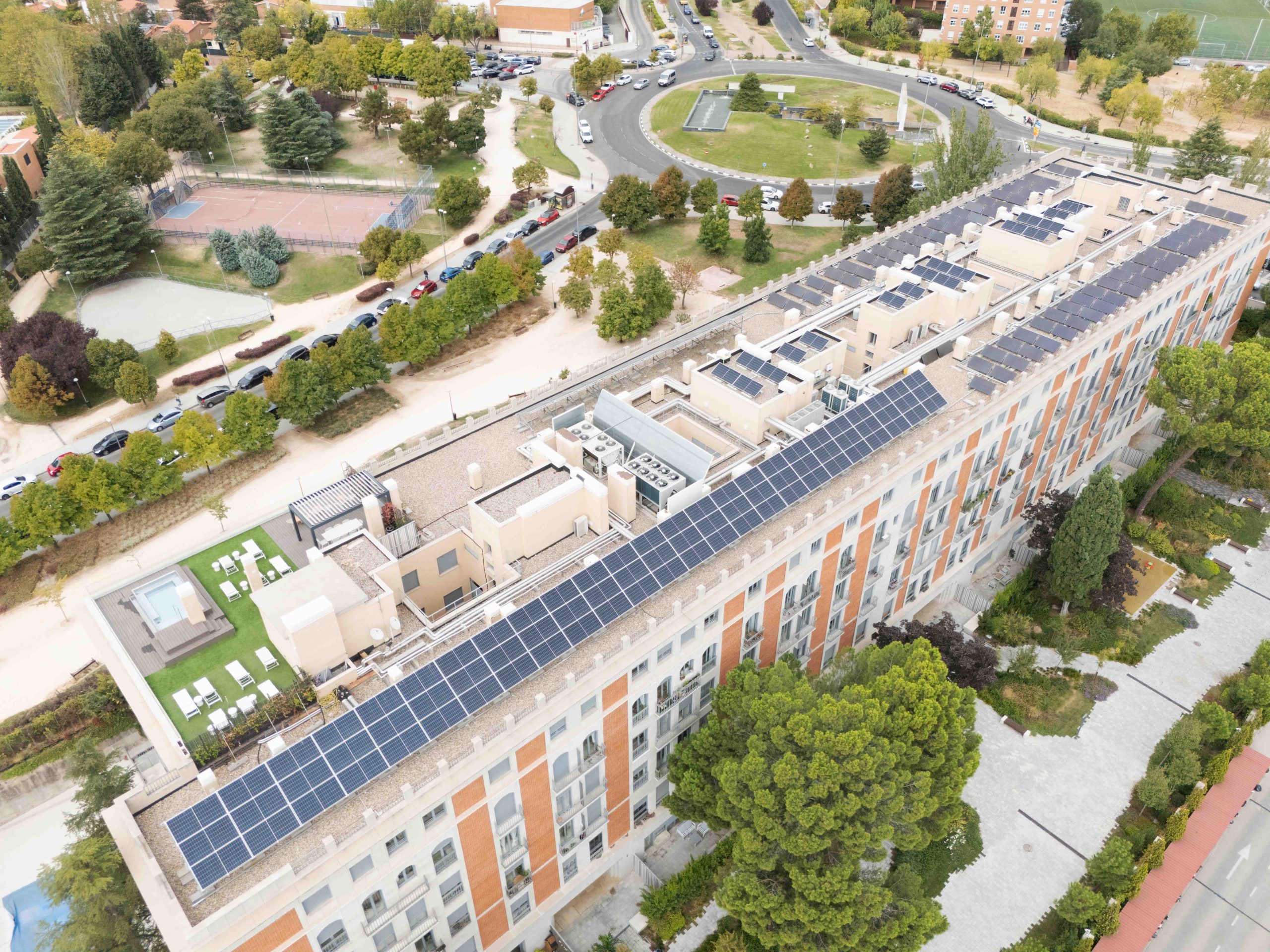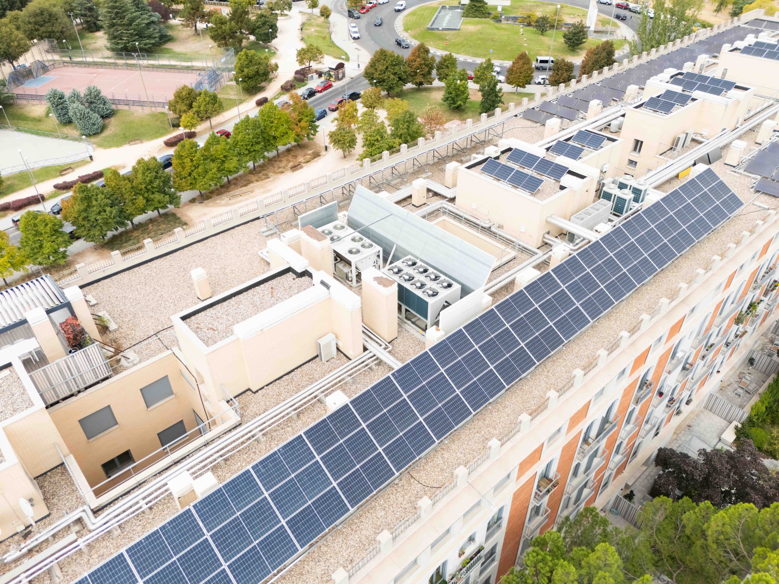 Este sistema utiliza la aerotermia y la energía solar fotovoltaica como fuentes principales de energía, permitiendo un ahorro del 66% de la energía del edificio. Se ha mejorado la eficiencia energética de las instalaciones y se ha incrementado el confort de los vecinos, ya que ahora cuentan con calefacción las 24 horas con mínimas oscilaciones de temperatura durante la temporada.