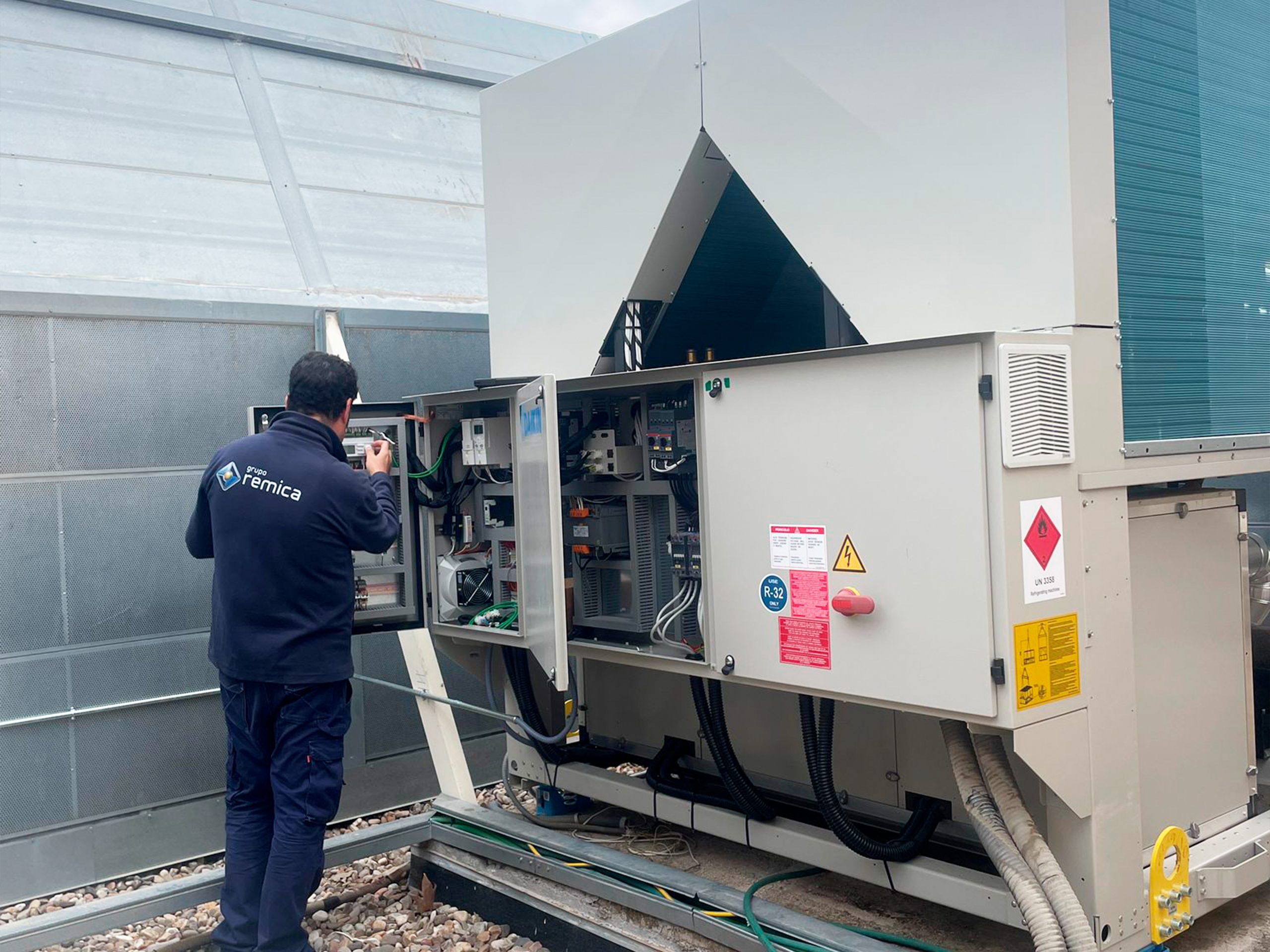 Remica ha llevado a cabo la rehabilitación del sistema de producción de calor y agua caliente sanitaria mediante el Plan Remica Hybrid Coste Cero. Este sistema híbrido combina aerotermia y energía solar fotovoltaica como fuentes principales, manteniendo las calderas existentes como sistema de reserva. Esto permitirá a la comunidad aumentar la eficiencia energética de la instalación y reducir la demanda energética.