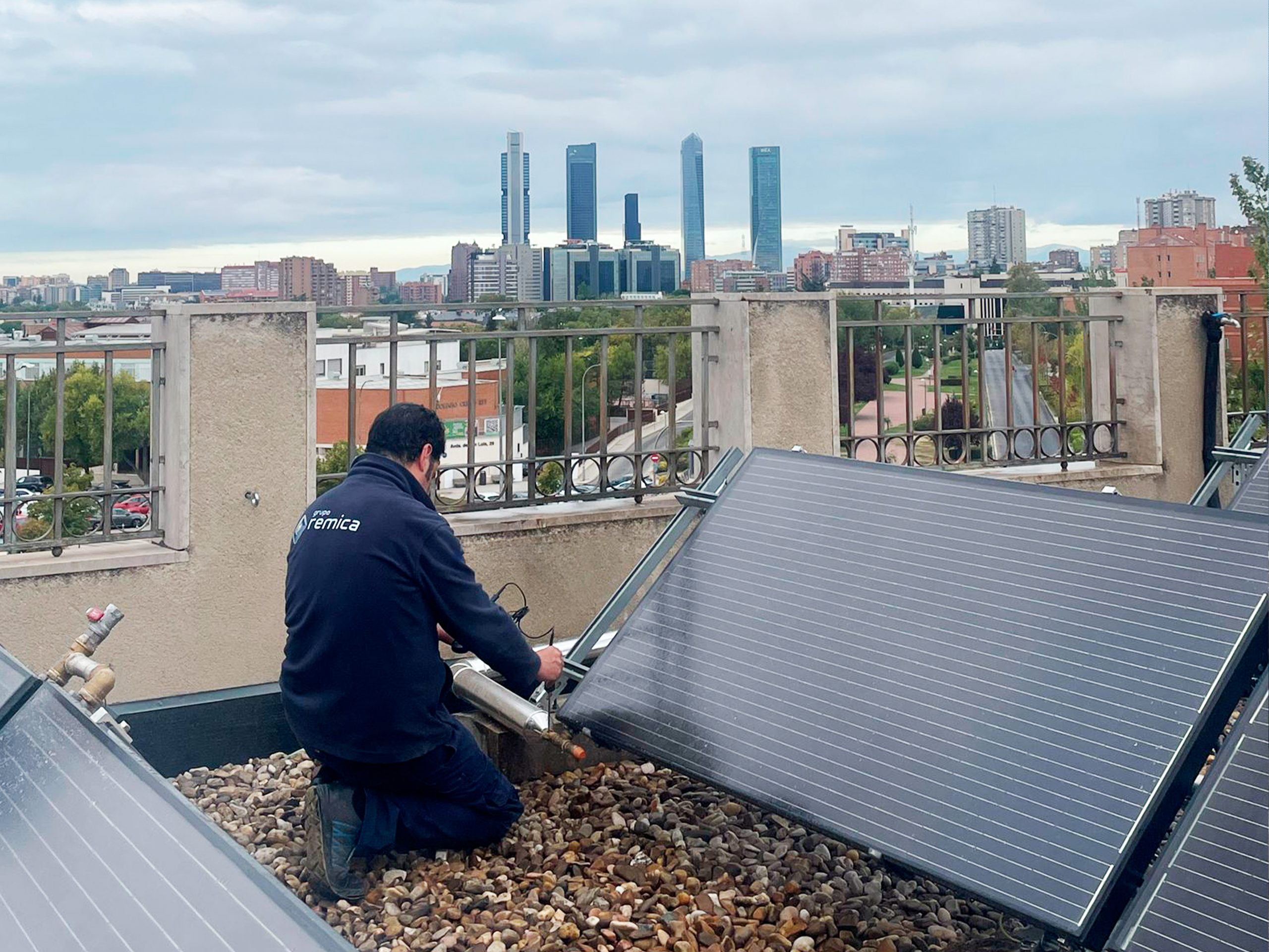 La intervención se basó en tres pilares diferenciadores del Plan Remica Hybrid Coste Cero: el CONFORT de los vecinos, el AHORRO energético y la VIDA ÚTIL de la instalación. La obra implicó la rehabilitación total del sistema de producción de calor y agua caliente sanitaria, para lo cual se instalaron 4 bombas de calor de alta eficiencia, 117 paneles solares fotovoltaicos de 550 Wp cada uno y 81 paneles híbridos termo-fotovoltaicos, manteniendo la caldera existente como apoyo.