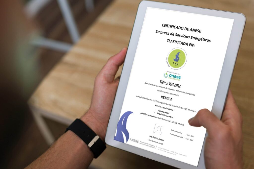 Grupo Remica sigue apostando por la gestión de calidad. El pasado 13 de mayo la compañía ha renovado el sello ESE plus 2 002 2022, un sello de calidad concedido por ANESE (Asociación Nacional de Empresas de Servicios Energéticos), que colabora con la certificadora independiente TÜV Rheinland como empresa auditora. La certificación hace referencia a la actividad como Empresa de Servicios Energéticos (ESE) y presenta una novedad respecto al anterior sello, incluye un nuevo distintivo referente a la regulación y control, que se suma a la especialidad relativa al HVAC (aire acondicionado, calefacción, ventilación y agua caliente sanitaria) que ya teníamos concedida desde el 2015.