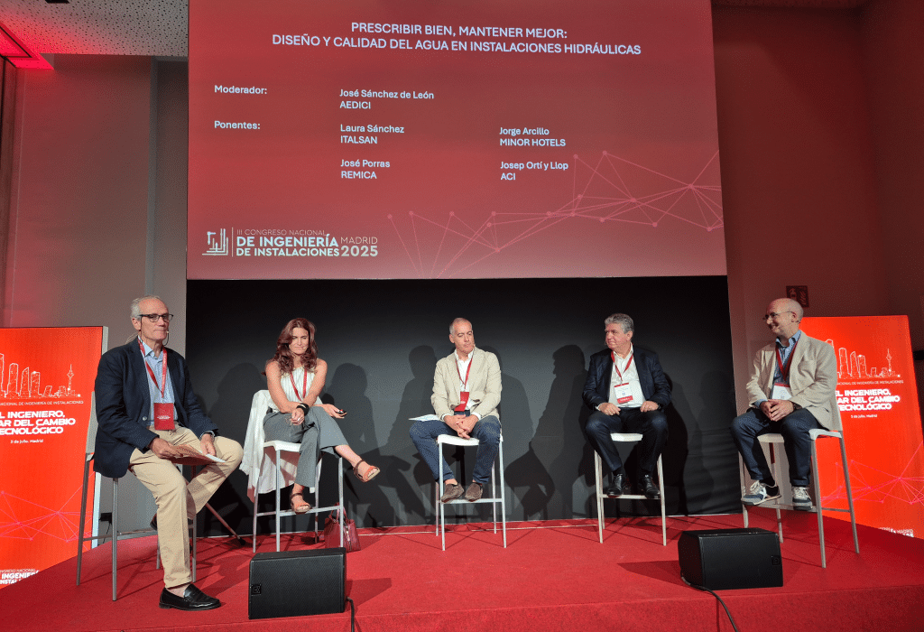 Junto a Porras, intervinieron: Laura Sánchez (Italsan), José Sánchez de León (Aedici), Jorge Arcillo (Minor Hotels) y Josep Ortí (Aedici-JG), ofreciendo una visión plural y especializada sobre la importancia del diseño, la prescripción técnica y el mantenimiento en la calidad del agua dentro de las instalaciones.